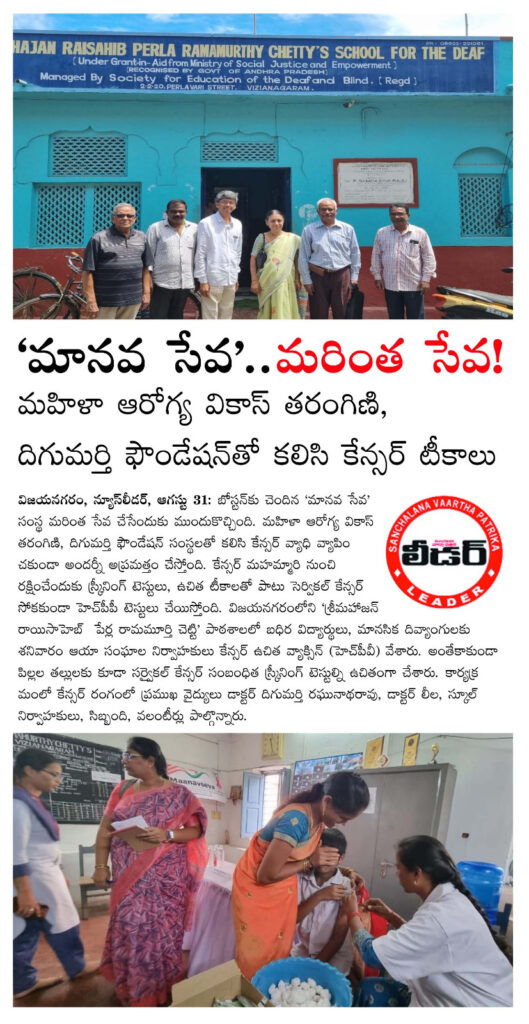 (e) Maanavseva together with our Indian NGO ECK and Digumarti Foundation have initiated our Mother and Child Program in those schools. After initial awareness camp on 31st July, Dr. Leela Digumarti and Dr. Raghunadha Rao Digumarti conducted their 1st round of HPV vaccinations to the eligible children on 30th August together with a screening camp for Mothers and Teachers.